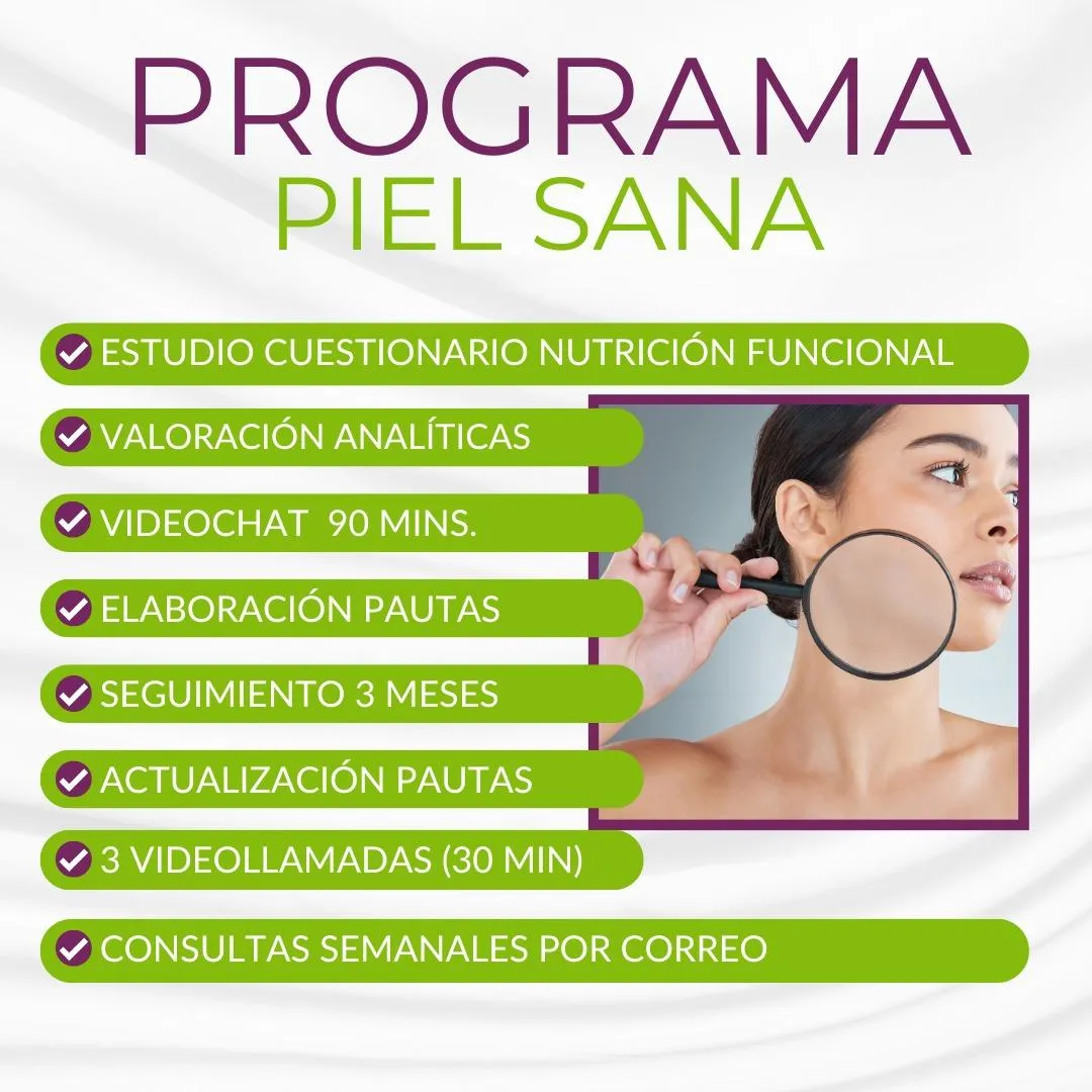 Programa Piel Sana 1:1 Premium es un acompañamiento online individual para personas con dermatitis y otros problemas de piel. Trabajamos tu caso desde la raíz con dermonutrición, salud digestiva, hormonas y estrés. Incluye sesiones privadas, materiales de apoyo y seguimiento cercano. El objetivo es lograr una remisión estable de tus brotes y que aprendas a cuidar tu piel desde dentro.